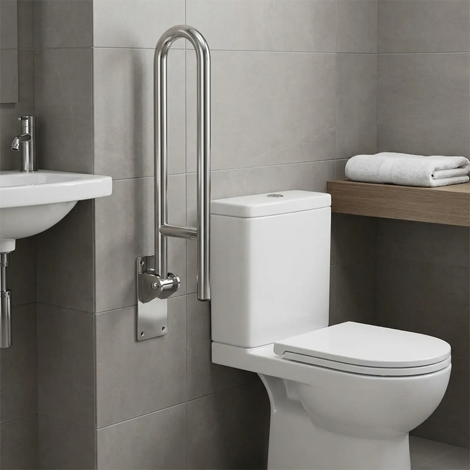 Um dos pontos fortes desta peça está no seu formato articulado. Quando não está em uso, a barra pode ser recolhida, o que ajuda a manter a área mais livre e mais organizada. Por isso, esse tipo de solução funciona muito bem em banheiros compactos ou em projetos que precisam equilibrar apoio funcional e circulação.