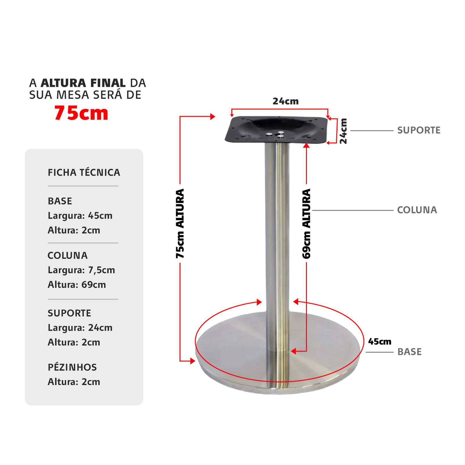 Com as medidas 45 cm largura e 75 cm de altura, esta base é projetada para oferecer estabilidade e durabilidade. Seu acabamento em inox escovado confere um visual elegante e é resistente a corrosão, tornando-a adequada tanto para ambientes internos quanto externos. Seja em residências, escritórios, restaurantes ou eventos.
