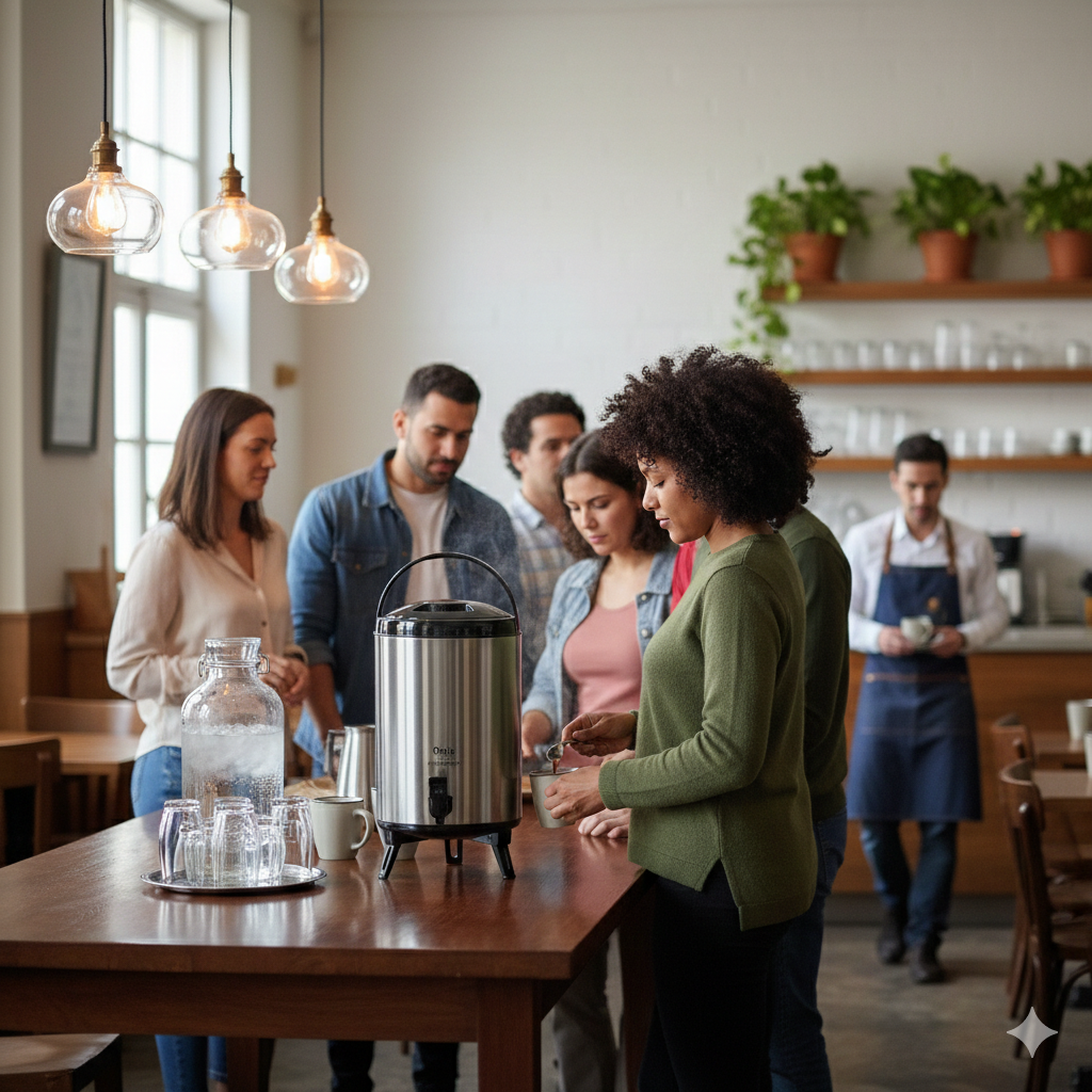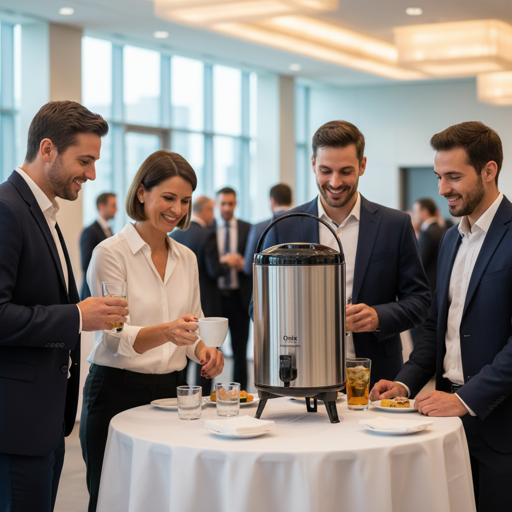 Botijão térmico de grande volume (13 litros), ideal para manter líquidos (água, café, sucos) quentes ou frios para servir grandes grupos de pessoas. Seu corpo é em aço inoxidável com revestimento isolante em PU (Poliuretano), garantindo uma excelente conservação da temperatura. O design robusto nas cores cinza e preto é perfeito para uso profissional em escritórios, eventos ou festas.