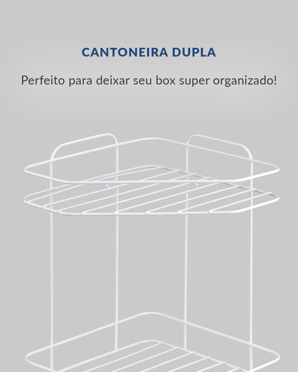 A Cantoneira Dupla Arthi é a solução eficiente para organizar shampoos, sabonetes e acessórios, aproveitando o espaço de canto do seu box ou área de serviço. Seu design de dois andares otimiza a organização vertical, mantendo seus itens essenciais sempre acessíveis.