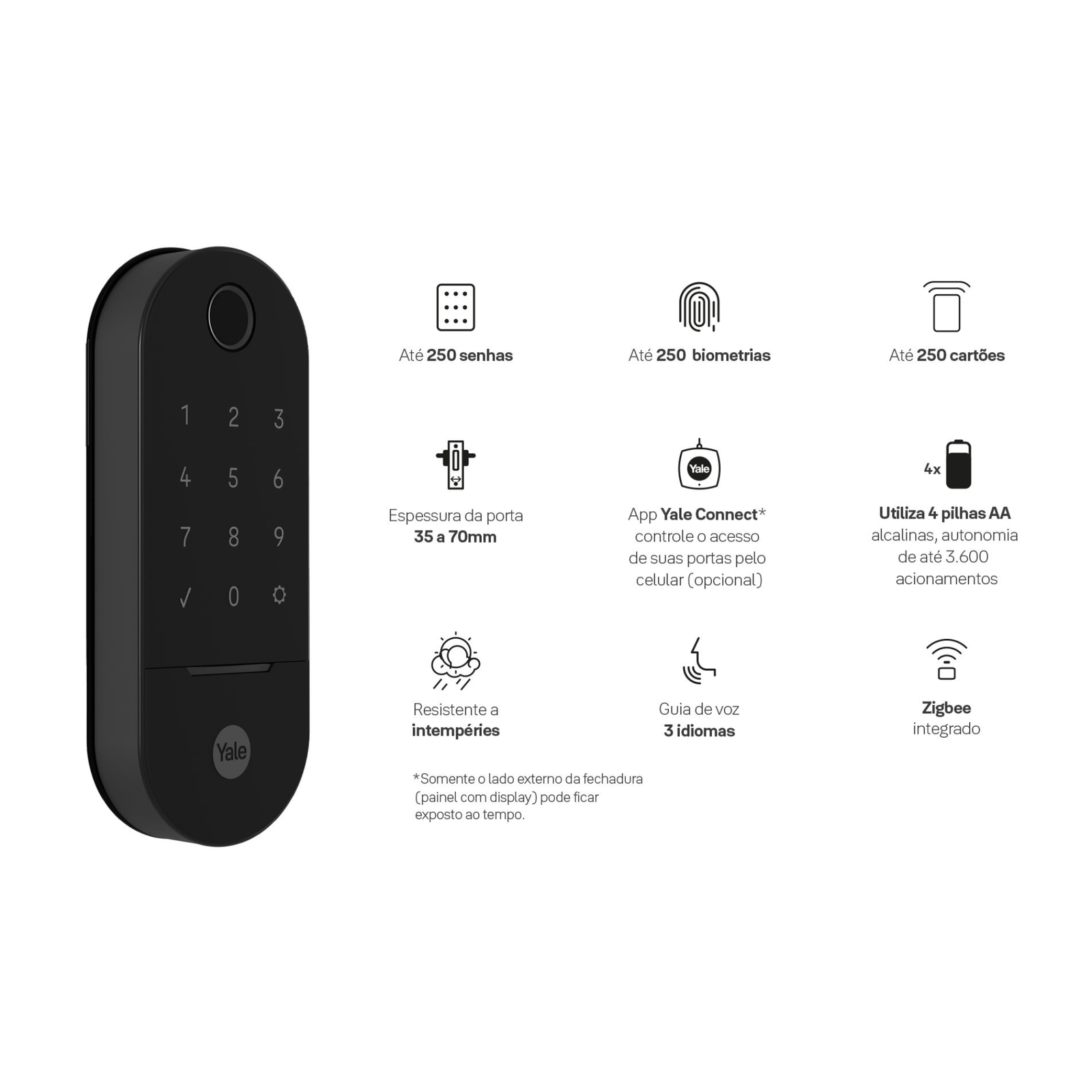 ✓ Controle Remoto Total: Acesso e gerenciamento via aplicativo Yale Connect com Zigbee integrado e Hub.