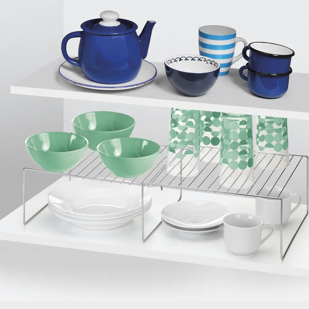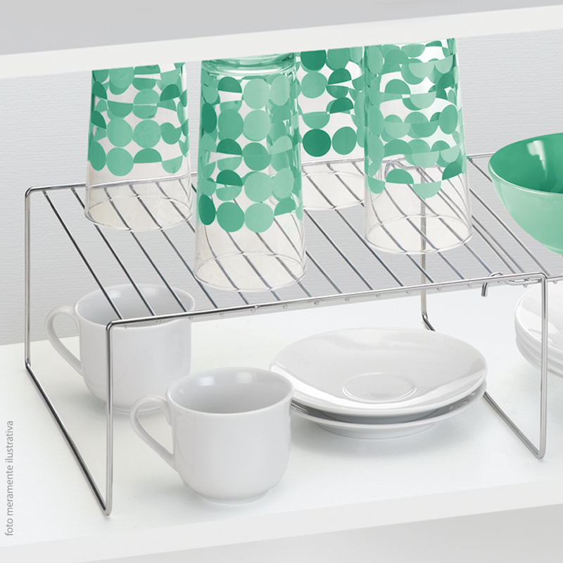 O Conjunto com 2 Prateleiras Extensíveis da Arthi é a solução ideal para dobrar o espaço vertical útil dentro de armários de cozinha, despensas ou balcões. Seu design permite ajustar a largura, maximizando a organização e o acesso a louças, potes ou alimentos.
