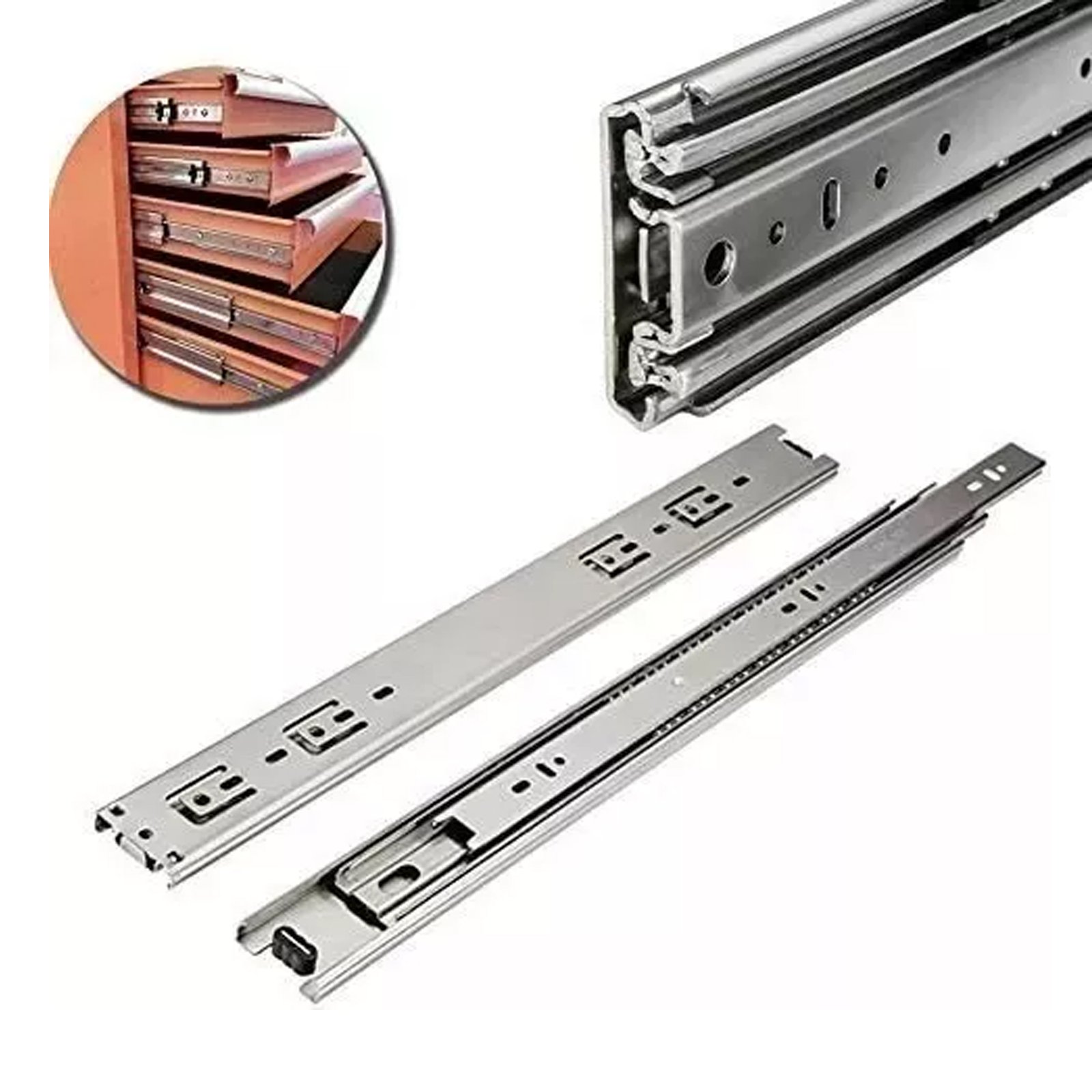 Diferente das corrediças comuns, o modelo da Renna oferece extração total, permitindo que você visualize e acesse até o fundo da gaveta com facilidade. Esqueça objetos perdidos ou gavetas que travam no meio do caminho. Com rolamentos de esferas de aço de alta precisão, o movimento é silencioso e estável.