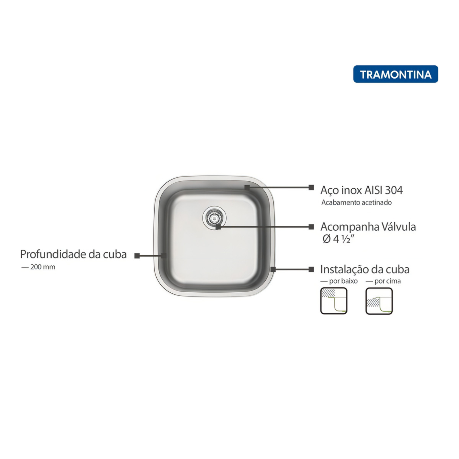 Cuba de Embutir ou Sobrepor Tramontina Aria Maxi 40 BS em Aço Inox Escovado 40×40 cm