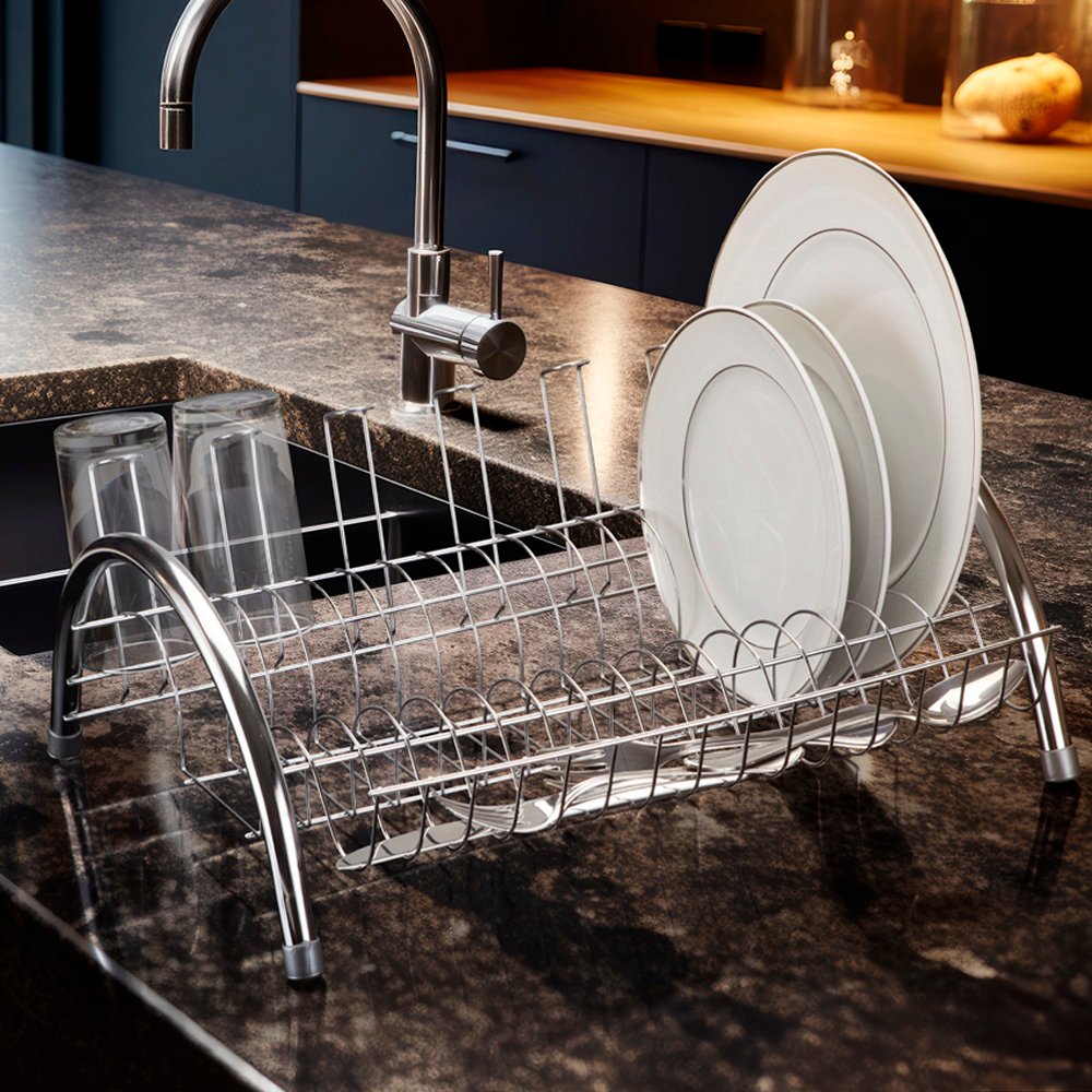 Este escorredor foi projetado para acomodar a louça de forma organizada e eficiente, garantindo que sua bancada permaneça funcional e sofisticada.