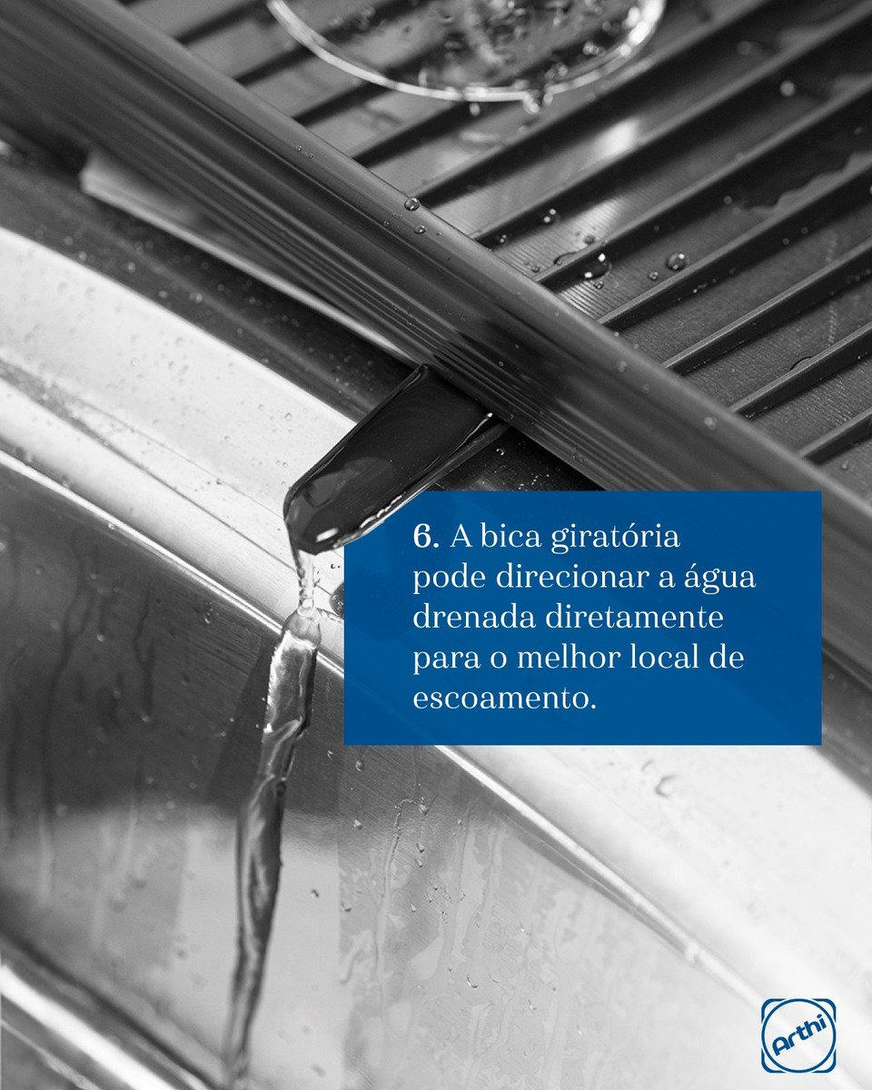 – Zero Molhação: Possui uma Bandeja Coletora inteligente que evita que a água escorra diretamente para a bancada. A Bica direcionável permite que você escolha onde a água será drenada, mantendo o ambiente seco e higiênico.