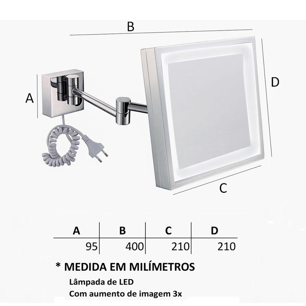 Produzido em latão, possui formato quadrado, conta com acabamento cromado e Luz de Led, oferece aumento de imagem em 3x ( 300% ) com movimento giratório regulável, ideal para você se maquiar, fazer a sobrancelha, colocar suas lentes de contato, fazer sua rotina de skincare, penteados elaborados e fazer até aquela Barba com precisão até mesmo em ambientes mais escuros.