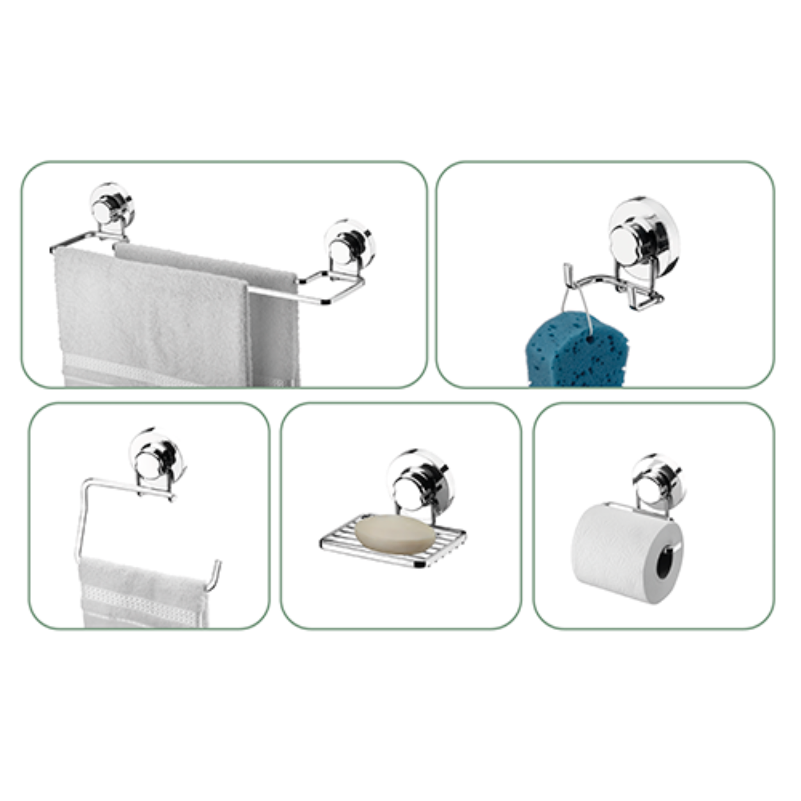 Conteúdos: 1 saboneteira, 2 toalheiros, 1 papeleira, 1 gancho.