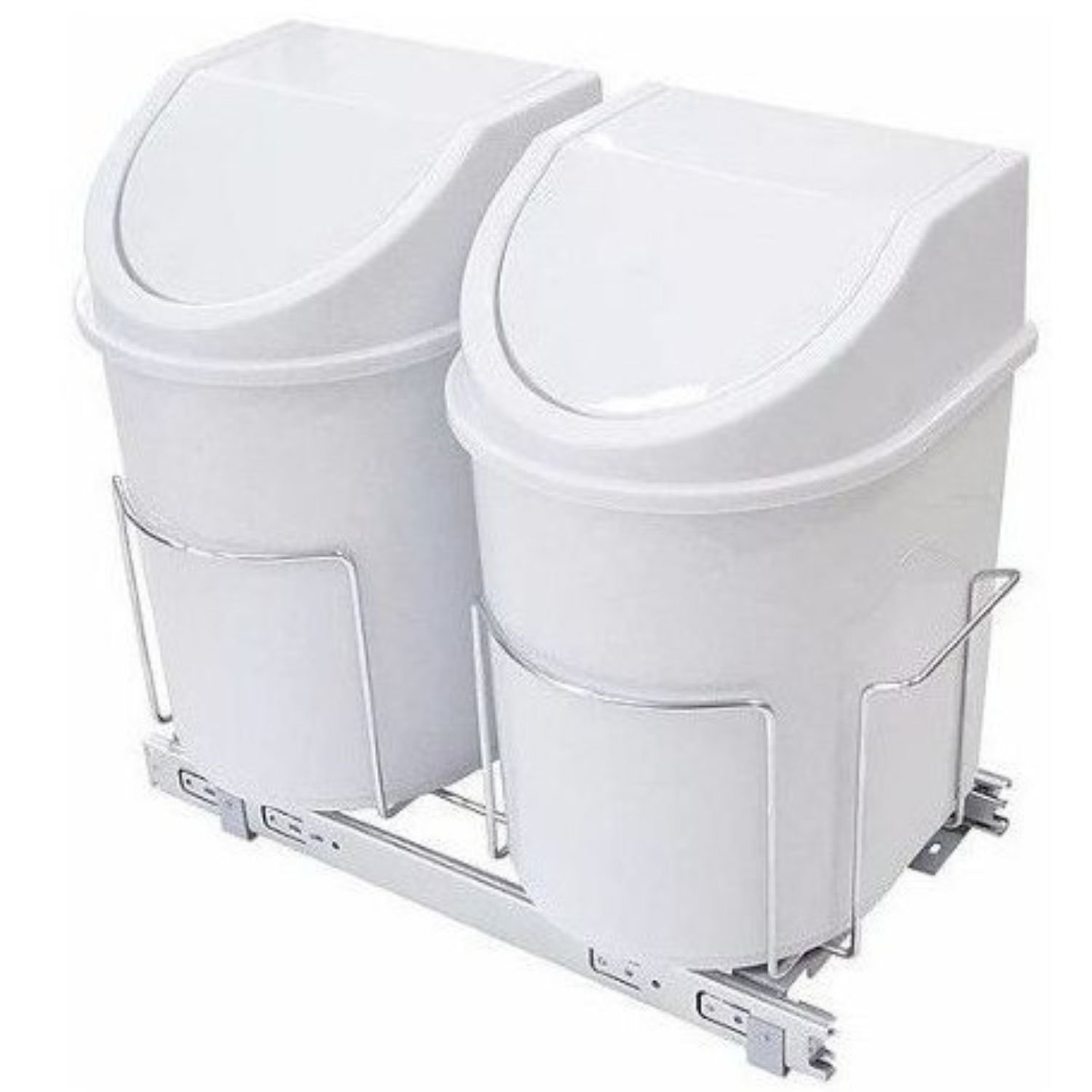 Lixeira Dupla de Base 24L (Cada cesto com capacidade para 12 Litros) Este produto é confeccionado em aço carbono. Acompanha a lixeira em plástico na cor gelo e tem capacidade total para 24L. Acompanha trilhos telescópicos, que vão montados na peça. Perfeito para nichos em cozinhas com instalação de base.