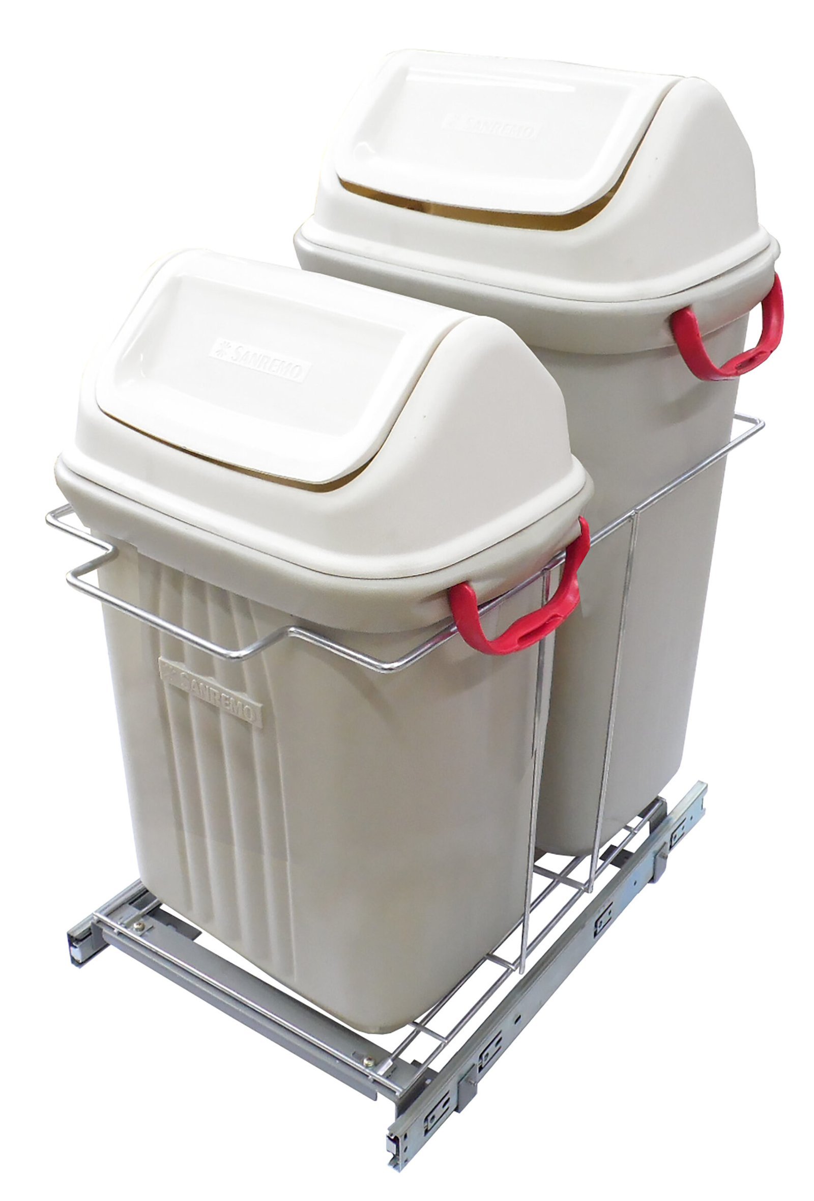 Acompanha a lixeiras em plástico na cor bege, sendo a maior com capacidade de 30L e a menor com capacidade de 19L.
