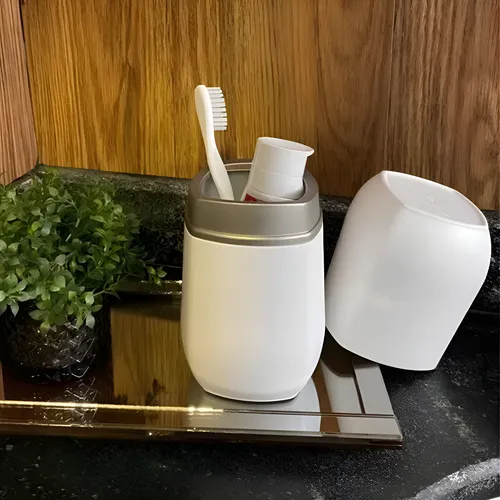 • Funcionalidade: Armazena escovas e pasta (com tampa).