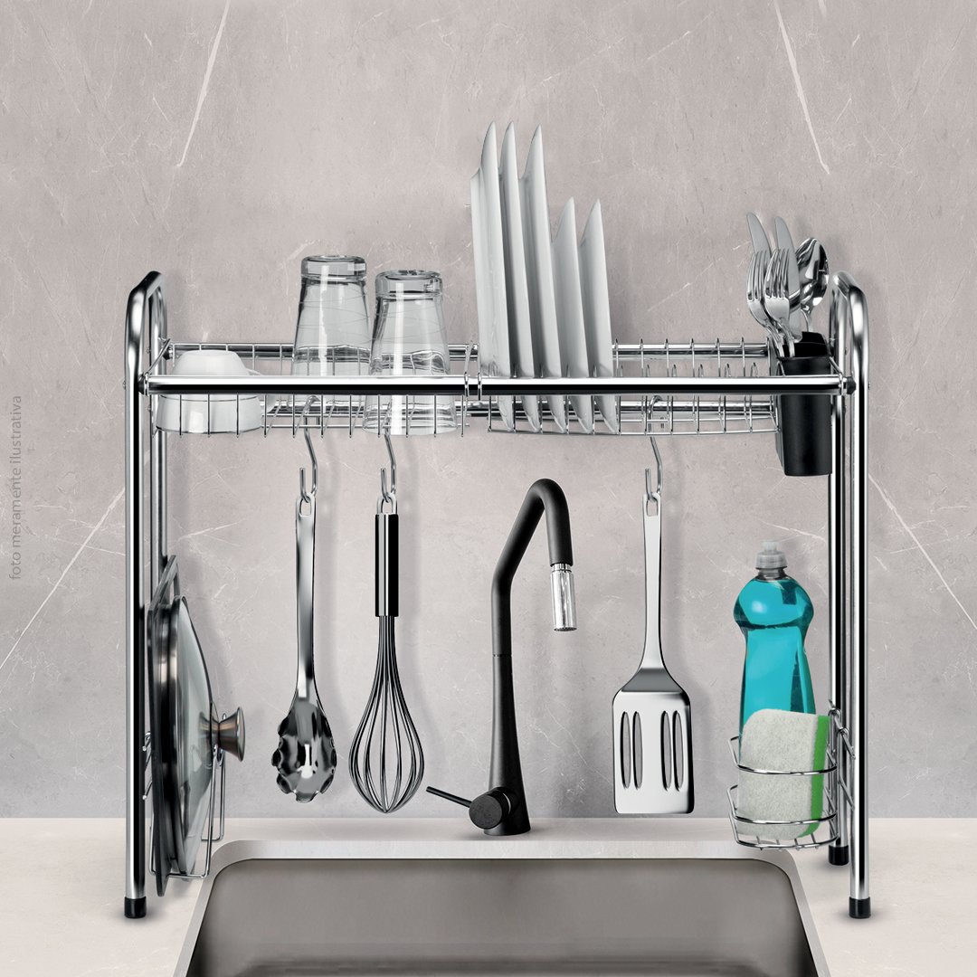 • Capacidade de Organização: Oferece múltiplos andares e compartimentos (acessórios inclusos) para secagem e organização de pratos, copos e talheres.