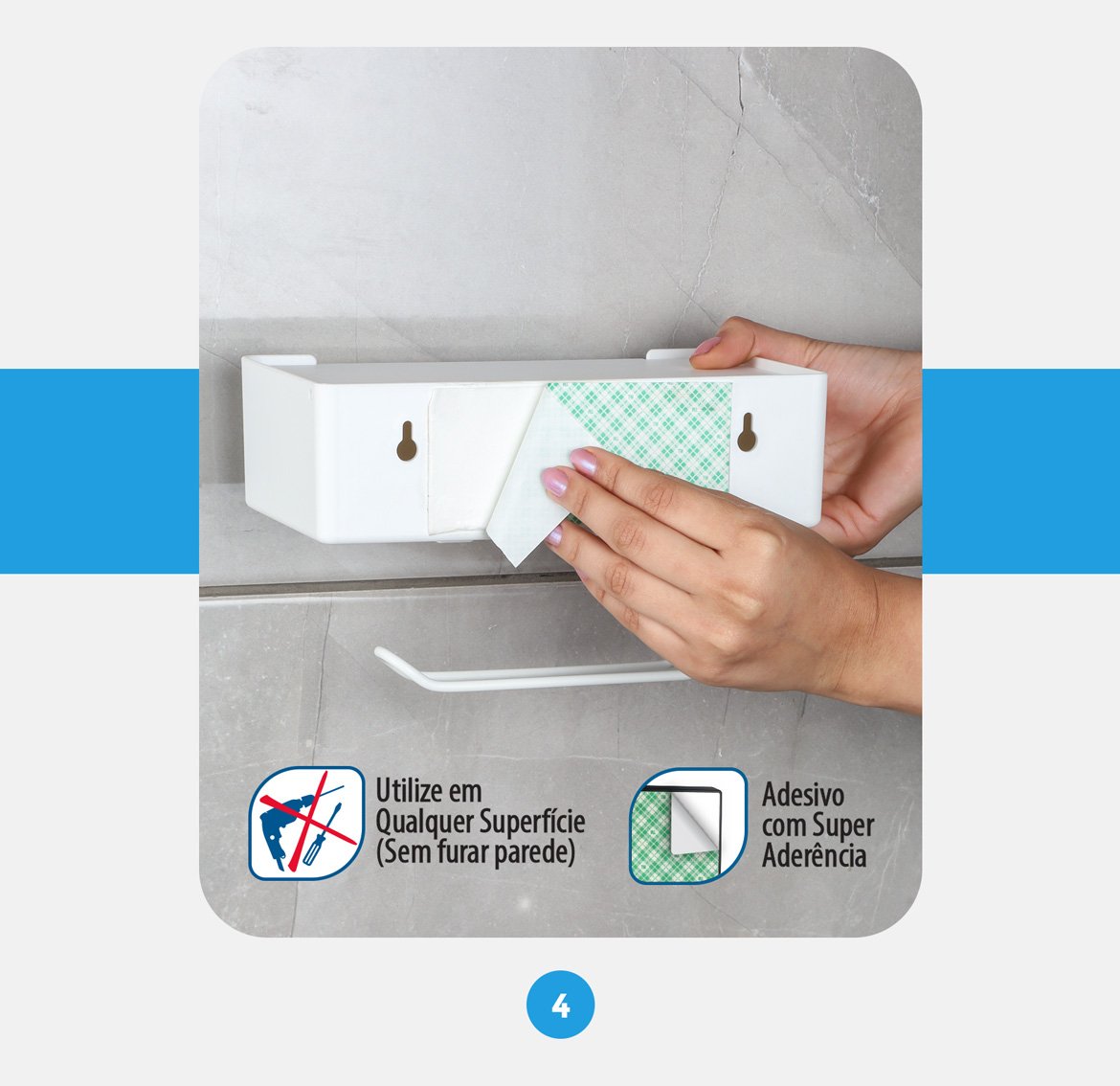 - Instalação Sem Furos: Fixação através de Adesivo de Dupla Face 3M (incluso), permitindo instalação segura e rápida em superfícies lisas, sem danificar as paredes.