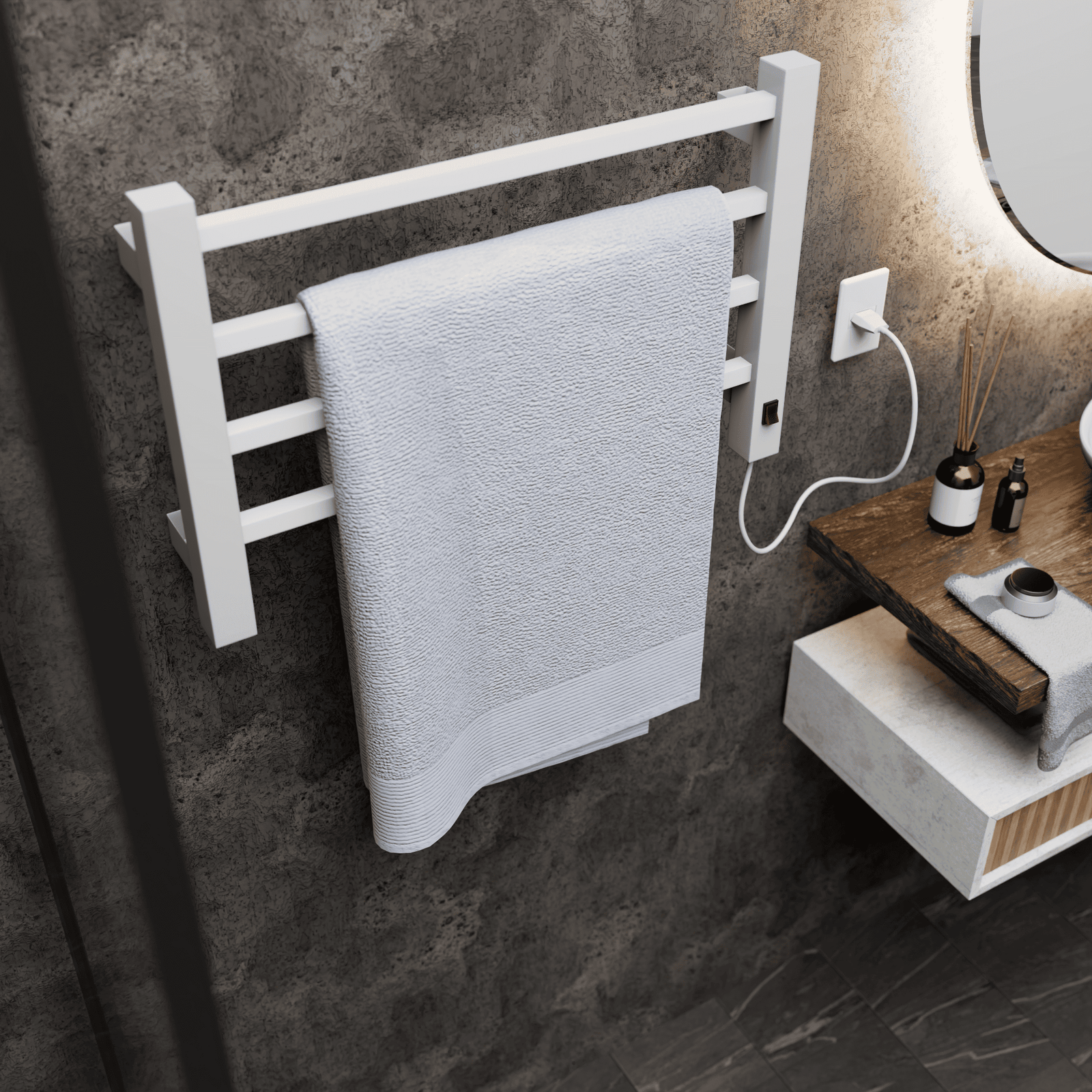 O aquecimento suave e constante (atinge no máximo 45∘C para sua segurança) não apenas proporciona a sensação deliciosa de se secar com uma toalha quentinha (especialmente nos dias mais frios), mas cumpre uma função essencial de higiene. O calor inibe a proliferação de fungos, ácaros e bactérias, eliminando o mau cheiro e garantindo toalhas mais limpas e seguras para toda a família. Sua toalha dura mais, mantendo-se macia e cheirosa por muito mais tempo.