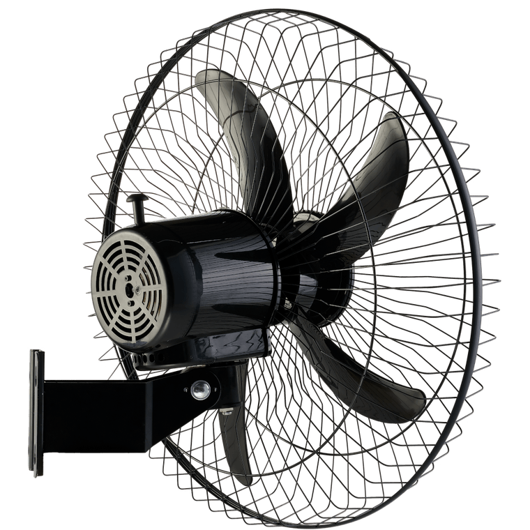 Componentes: Duas grades de proteção; Hélice com 5 pás; Controle de 3 velocidades; Trava de regulagem de inclinação; Botão acionador de oscilação; Suporte para fixação na parede.